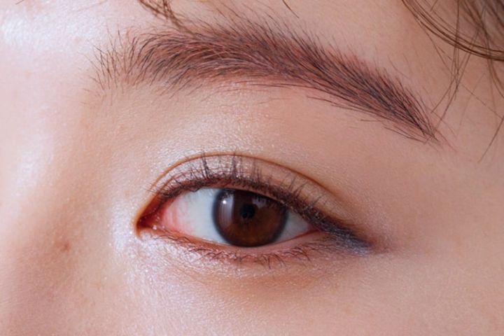 目頭をくの字で囲むように、1-aを上まぶた、1-bを下まぶたにそれぞれまぶたの1/2にオン。1-cを細チップにとり、目尻の先端に切り込みを入れるように短くラインを引く。
