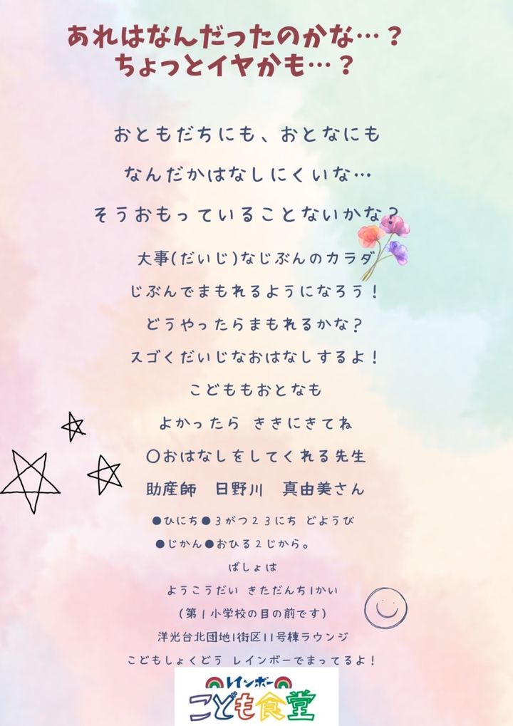 朝の支度から夜の片付けまでたくさんの子どもたちがいる【こども食堂レインボー】では、今年子どもたちとの話し合いの会を開いていきたいと思っています。自分の思っていること。嬉しかったこと。ちょっと困ったこと。「自分のことを知ること&相手のことも知る」。子どもも大人もみんなで話していきたいです。まずは「自分自身を守ること」について考えるお話し会を、助産師の日野川真由美さんを迎えて開催します。幼いお子さんでもわかるような【大切な性】のお話し会です。日時は、3月23日14:00〜子どもも大人も、ぜひぜひ来てください!