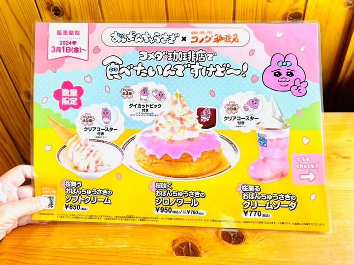 他にもコラボメニューには、「桜薫る おぱんちゅうさぎのクリームソーダ」、「桜舞う おぱんちゅうさぎのソフトクリーム」もあります。こちらの2品には「おぱんちゅうさぎ」のクリアコースターが全5種のうちランダムで1枚ついてくるので、何が出るかはお楽しみです。コラボ商品は4月上旬までの販売予定ですが、数量限定のため各店でなくなり次第終了となります。気になる方はぜひこまめにチェックして、お早めにお店でオーダーしてみてくださいね。