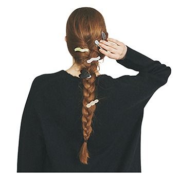 チアフルなカラーリングや多種多様なかわいいモチーフのアクセサリーを自由に配置。少女のような三つ編みと相まって、シックな黒が地味に映らず、活気のある見た目へ盛り上がる。