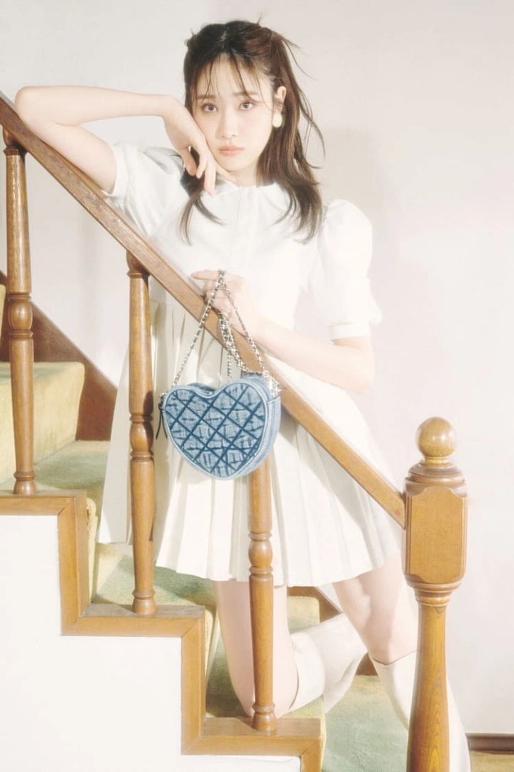 白ポロプリーツミニワンピース(4月発売予定)16,280円/lilLilly(lilLilly TOKYO) イヤリング 4,860円/アビステ ハートデニムバッグ 11,500円/チャールズ&キース(チャールズ&キース ジャパン) 白ロングブーツ 19,800円/LA BELLE ETUDE(アンティローザ)