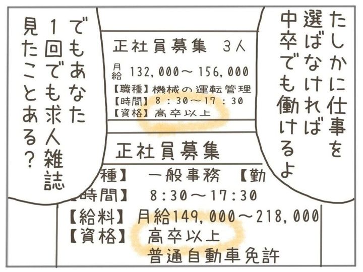 ところが、今度は「学校生活が大変だから」という理由で高校中退をほのめかします…。さらに、中卒でも高校中退でも、就ける仕事に大差はないと言う姪…。選ばなければ仕事はできますが、叔母は働くことを軽視しているような姪の発言に苦言を呈します。そして、一時の感情で「退学」という大きな決断をしてしまわないように言い聞かせました。