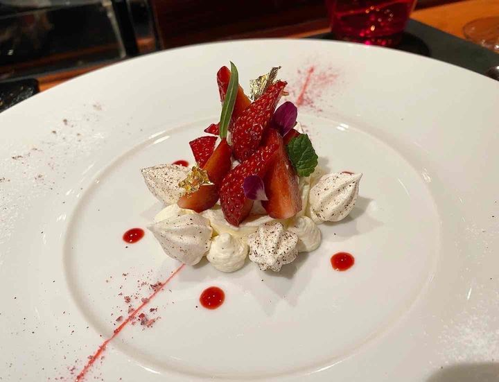 「苺のパブロヴァ あまおうのソルベとメレンゲをアクセントにして」には、提供時にいちごのソースをかけていただけます。フレッシュないちご以上に香り高くて濃厚なソースがクリームやソルベ、メレンゲと混ざり合ってとても美味しかったです。