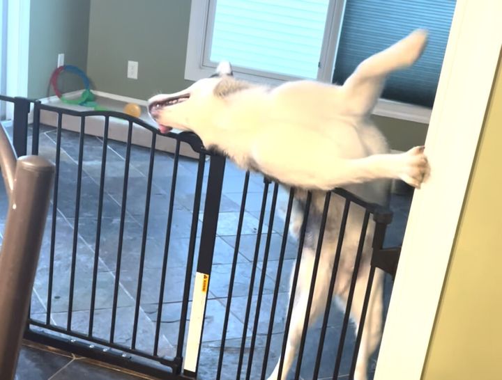 脱走を企むハスキー犬。カッコよくジャンプするのかと思ったら、体の柔らかさを使って
