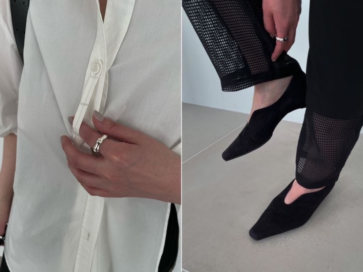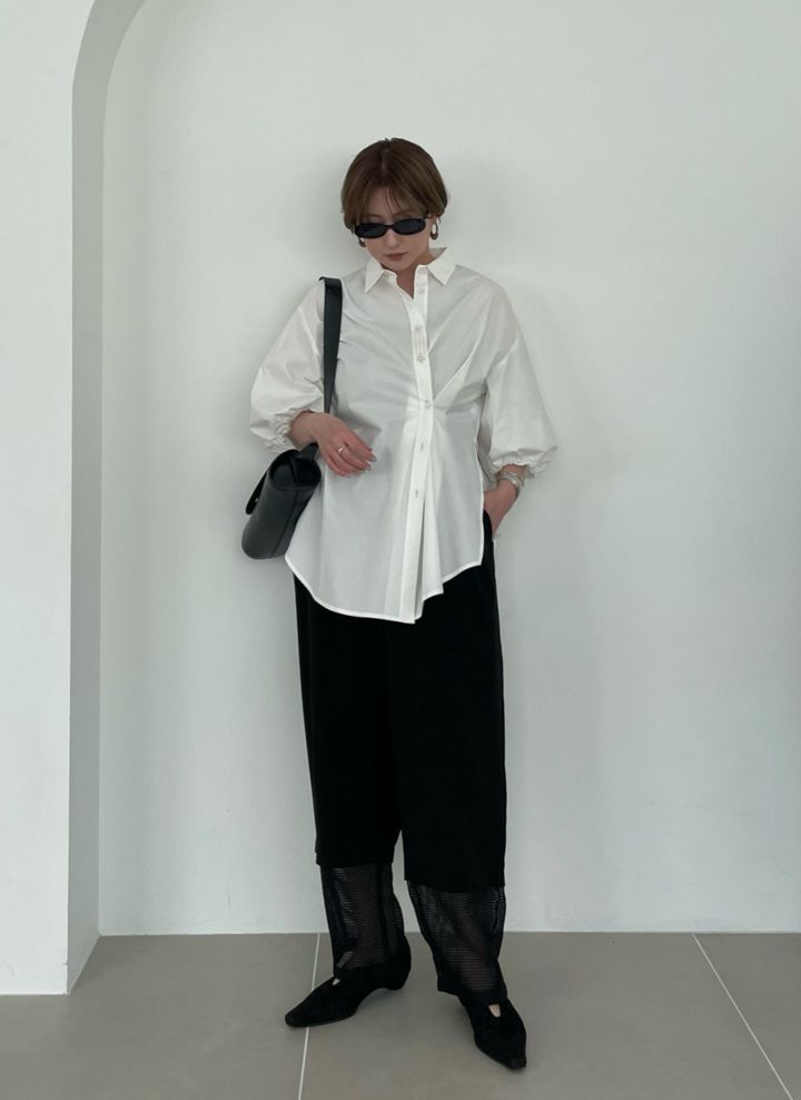 「モノトーンでまとめた一見モードな印象のパンツルックですが、シャツのパフスリーブやパンツの裾の透け感など、ディテールで甘さと女性らしさを演出しています。シンプルな中にさり気ないデザインをプラスしつつ、二の腕や腰まわりなどシルエットで体型カバーも叶う大人コーデです」