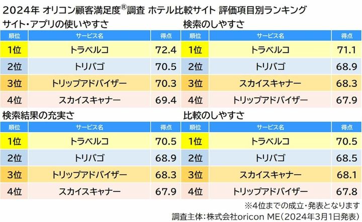 「サイト・アプリの使いやすさ」「検索のしやすさ」「検索結果の充実さ」「比較のしやすさ」の全4つの評価項目別ランキングでは、初の全評価項目1位を記録。