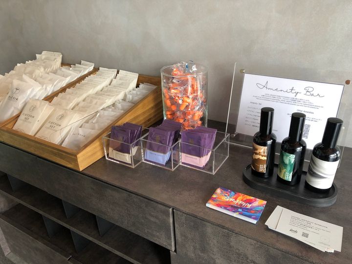 フロント横にはアメニティが揃っています。ホテルオリジナルアロマのお試しもできます。