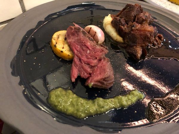 メインの肉料理はポークスペアリブとジャージー牛カイノミグリルマッシュポテトにグリル野菜とボリューム感のあるメイン料理です。肉の食感も柔らかく味も申し分ありません。ソースが肉の旨味を引き出してくれます。グリル野菜も甘みが感じられます。