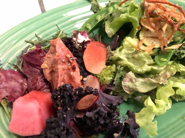 サラダは産地直送の鮮度の良い野菜を使用しています。パリパリのごぼうチップにレタス、※フムスの素材と相性が良いです。 ※(つぶしたゆでヒヨコマメ、ゴマのペースト、すりつぶしたニンニク、レモン汁、塩、オリーブオイルなどで作るペースト状・ディップ状の料理)