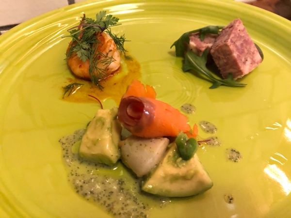 ディナーメニューの一部、前菜はアボカドサーモンマリネ、パテ・ド・カンパーニュ、ガーリックシュリンプアリッサソースです。素材の鮮度の良さを感じるお料理です。 (※本メニューはオープン記念特別メニューですので通常のメニューとは異なります。)