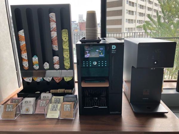 コーヒーマシーンと紅茶のティーバッグもあります。ドリンクメニューも充実しています。