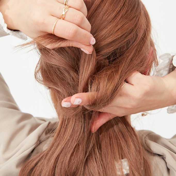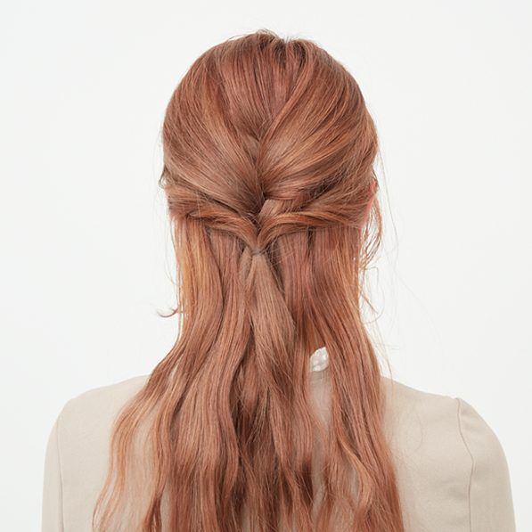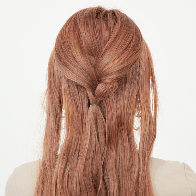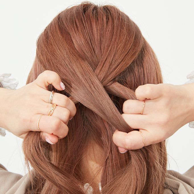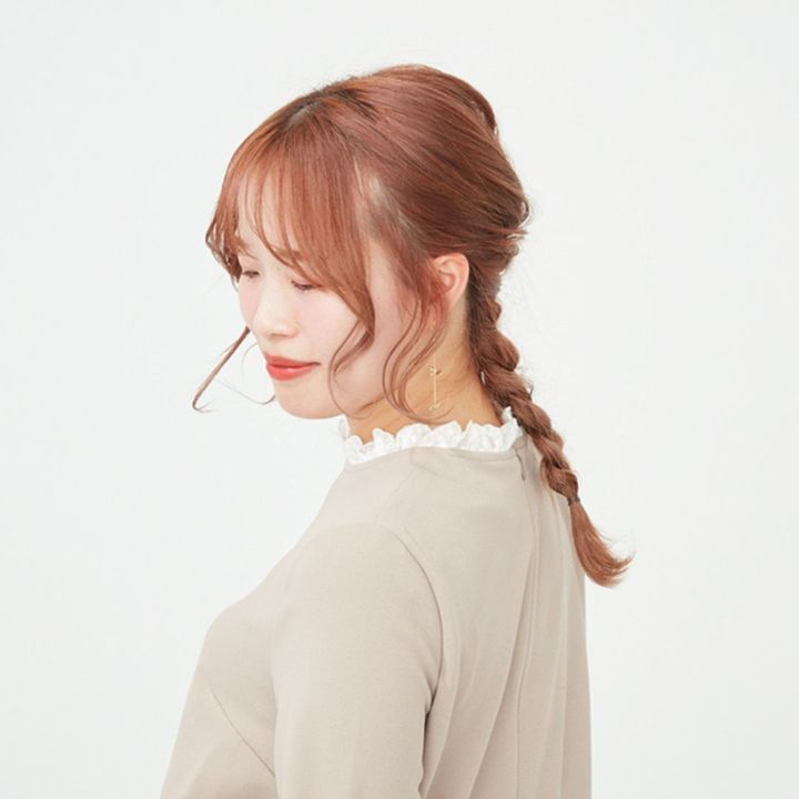 サイドの髪を後ろでまとめ、三つ編みの上でゆるめにゴムで結び、くるりんぱする。