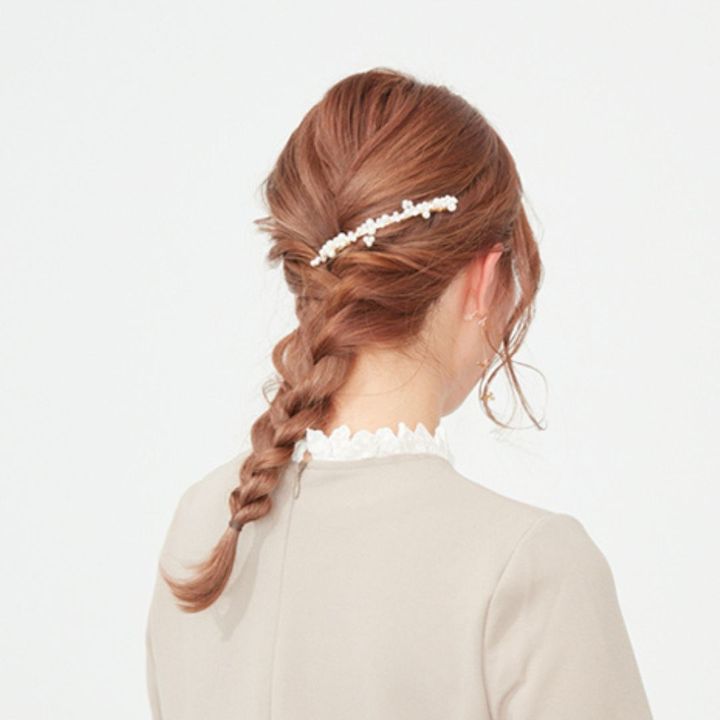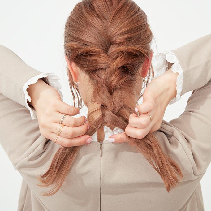 残った髪を編み込みにする。きつく編み込み、毛先をゴムで結んでから毛束を引き出してニュアンスを作る。