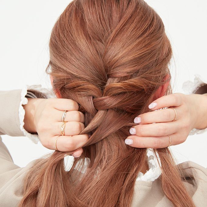 分け取った毛束を三つ編みに。1段三つ編みにしたら、ゴムで結ぶ。