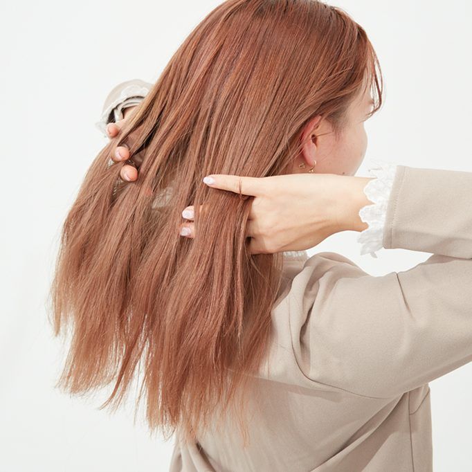 手ぐしを通すように髪全体にオイルをなじませる。オイルをつけておくことでアレンジしやすくなる。