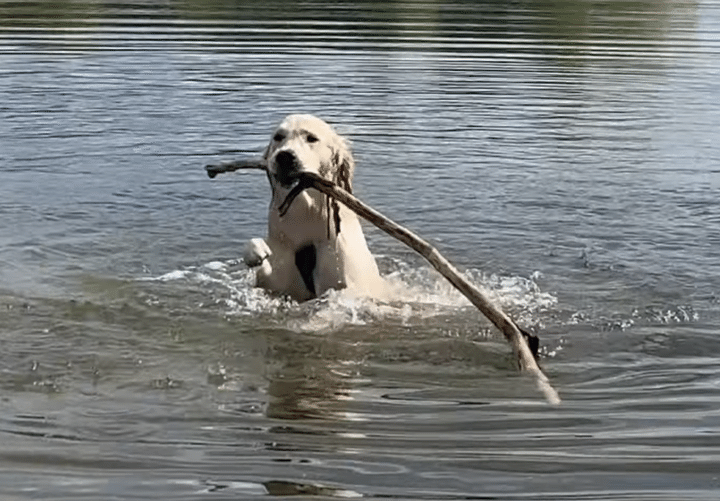 犬「今日の収穫はこれー♪」 大きな枝を泳いで持ってきたよ!