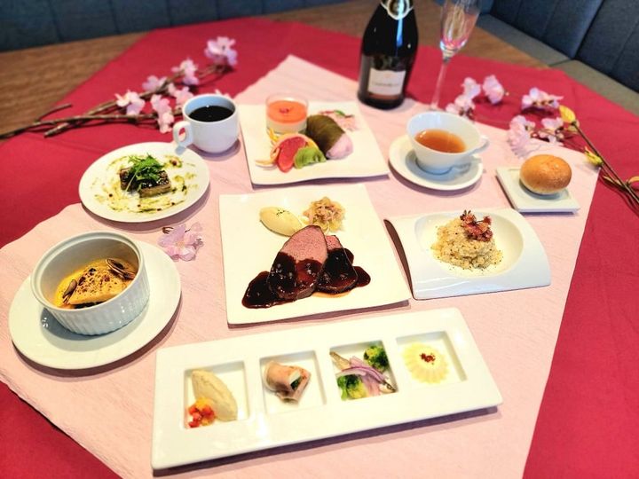 暖かい日差しの下で春の訪れを感じつつ桜を楽しみたい時はランチを、ライトアップされた幻想的な雰囲気の夜桜や都心の夜景を楽しむならディナーと、時間帯は2種類設定されています。提供される料理はフレンチと和食いずれかのコースを選択できます。