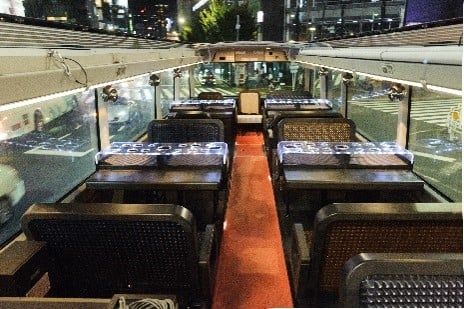1階にキッチン、2階には対面式の座席とテーブルを備えたレストランバス。アルコール類は料金別途(画像:WILLER株式会社リリース)