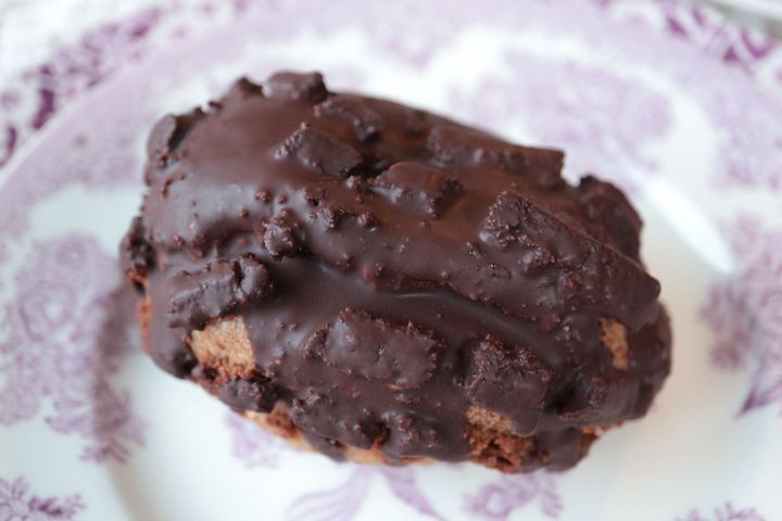 袋から商品を取り出してみると、パッと見た感じ、ゴツゴツしたこぶしのような形をしています。よく見かけるエクレアの形より、丸っとしています。長さは約9cm。ココアクッキーが乗ったエクレアにチョコレートのクリームでたっぷりコーティングされていて、とてもおいしそうです!