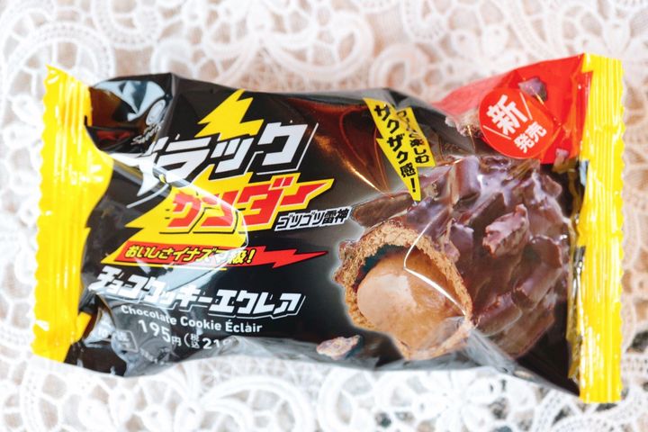 お馴染み、ブラックサンダーの黒と黄色のパッケージが目を引きます。パッケージには「おいしさイナズマ級!」「クリームと楽しむザクザク感!」という文字が。ビジュアルからもエクレアの上にのったクッキーのザクザク感が伝わって、楽しみです♪