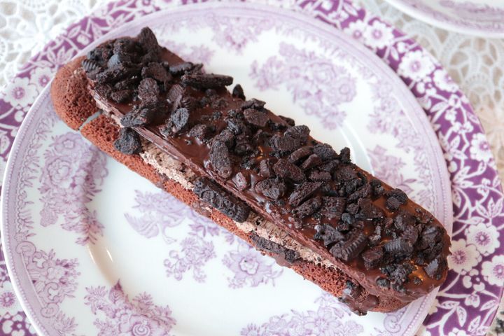家に帰って長さを計ってみたら期待通りの長さ、約17cmありましたよ。これは食べ応えありそう!黒いココアビスケットがクッキー全体にトッピングされていて、いかにもザクザクしてそうなビジュアルです。