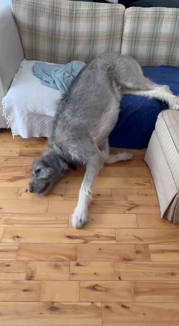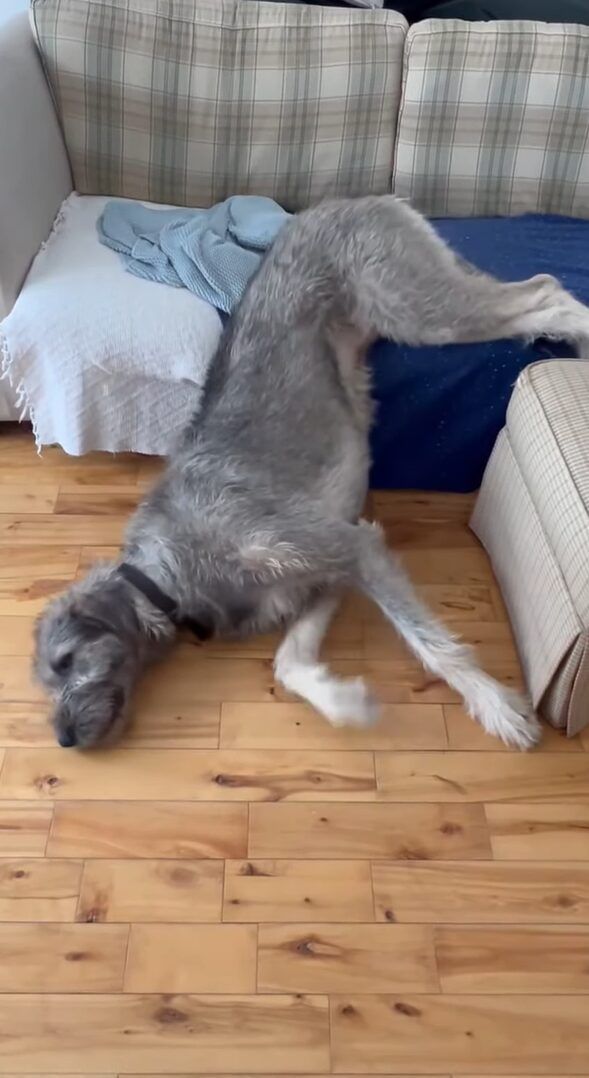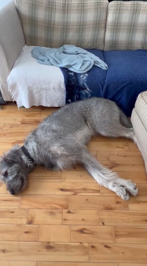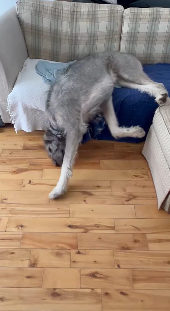 3. ズルズル・・ドスン。まどろんでいたアイリッシュウルフハウンドがソファから落ちちゃった!!【海外・動画】