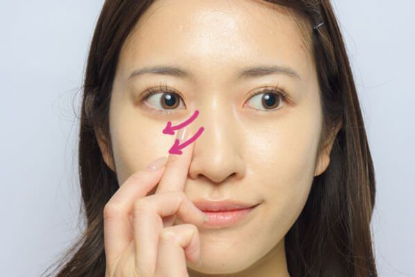 Tゾーン、鼻先、アゴ先にファンデを薄くのせたら、鼻の両サイドにすべらせるように叩き込んでなじませる。
