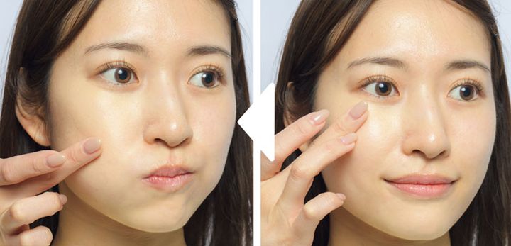 目の下とほうれい線にBをのせ、こめかみ横までのばしながら垂直に叩き込むことで、目元のくすみ感を取り明るくする。
