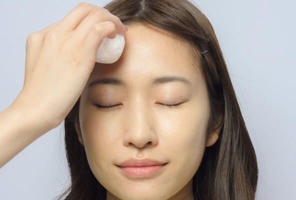 Cのパウダーをパフに取り、おでこにのせる。赤ちゃんのお尻のようなキメの細かいサラサラ肌に♡