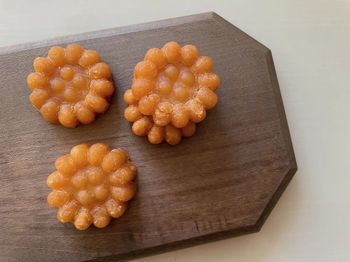 一般的には写真のように花のような形をしていて、手のひらサイズのものが多く売られています。一口サイズの小さいものもあったりして、その種類は豊富。スーパーやコンビニ、駅や町のお菓子屋さんなど様々な場所で買うことができますよ。