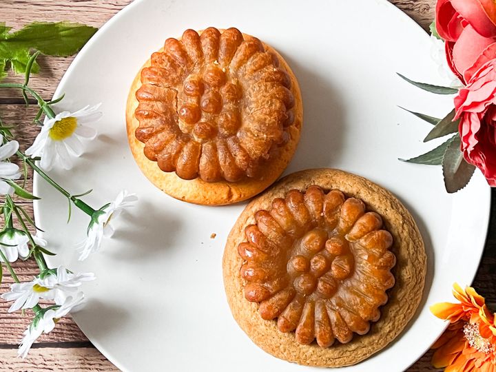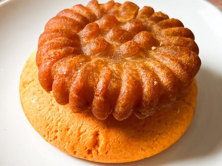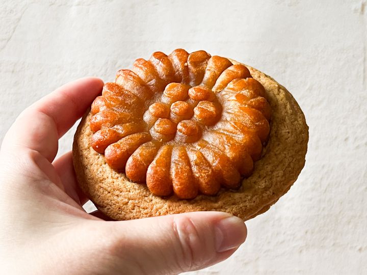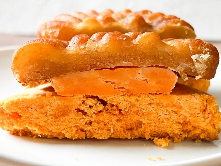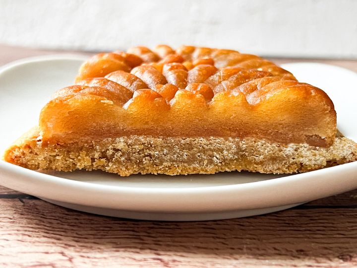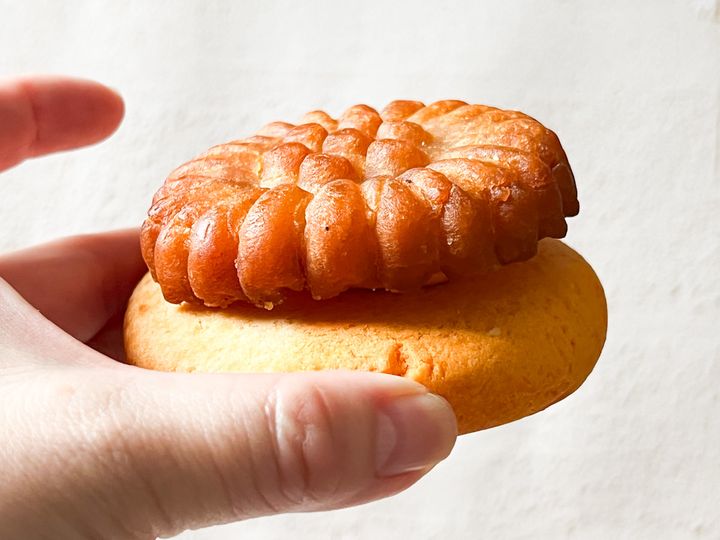 半分に切ってみると、本当にクッキーの上に薬菓をのせただけ。洋菓子と韓国の伝統菓子の組み合わせがどんな味になるのか気になります。