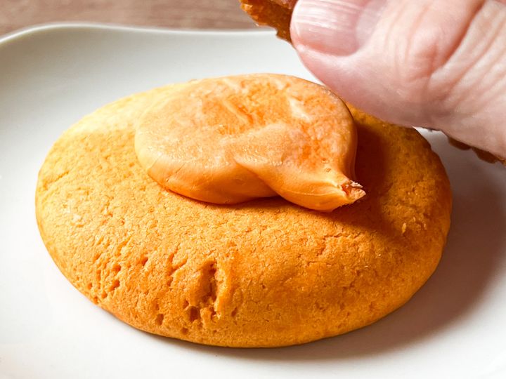 一体どんな味がするのかと食べてみると、クッキーとガナッシュはチーズの風味が効いていて塩気がありました。クッキーは「オリジナル」のザクザククッキーとは違い、ふんわりやわらかい食感です。