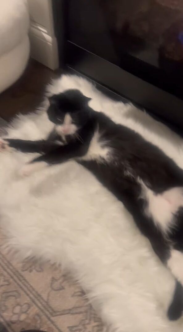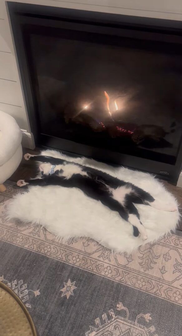 3. 猫は一番いい場所でお昼寝中!暖炉の前でのびのびとおてても足もめいっぱいのばして心地よさそ~!!【アメリカ・動画】