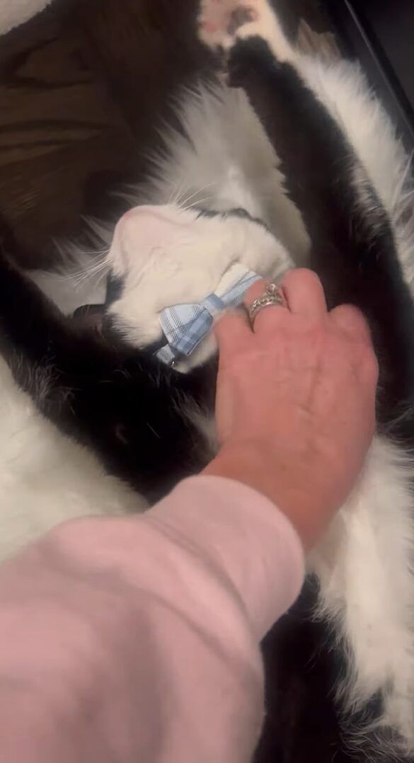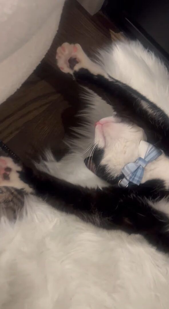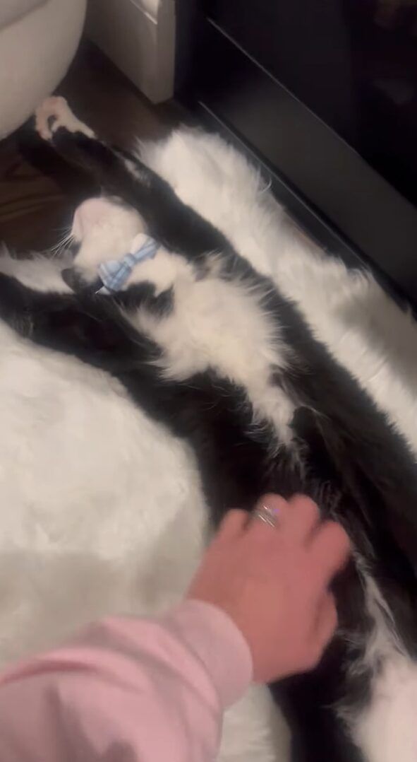 そんな愛猫のおなかを、飼い主さんがナデナデ。 すると、これがよかったのか、おてても足もさらにめいっぱいのばして見せました。