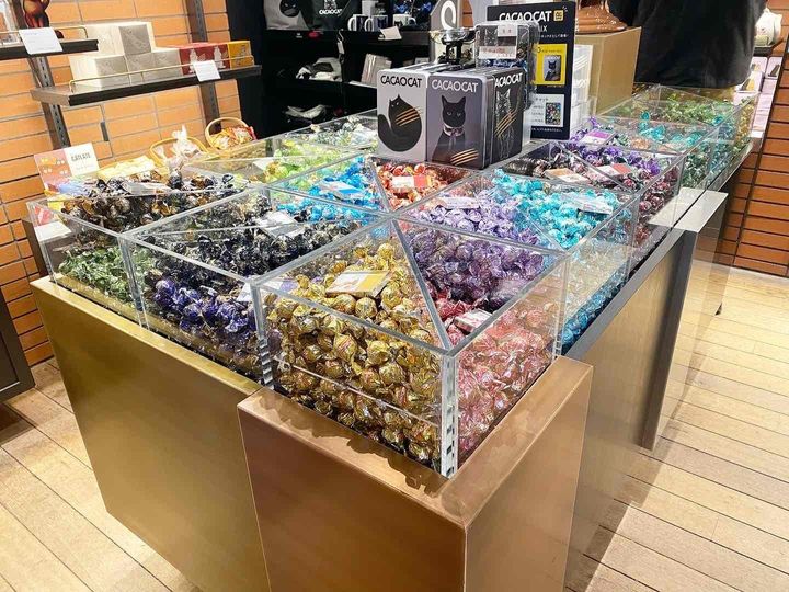 【CACAOCAT & Chocolate Origin 白金台店】は大きく2つのスペースに分かれていて、ひとつはクッキーやチョコレートなどの「猫型スイーツ」や看板商品でキャンディのようなポップな包紙のボンボンショコラなどを取り扱うショップスペースです。