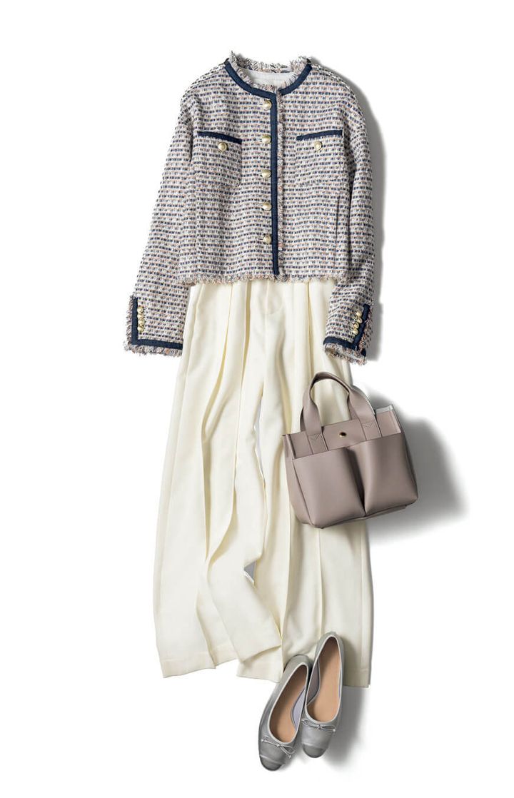 華やかなミックスツイードのジャケットを、白のパンツで引き立てて。パンツのしなやかな落ち感が、デートでは女っぽさの演出に。ジャケットのボタンとリンクするシルバーのバレエシューズで、さりげなくリッチ見せも♪