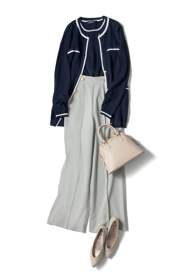 黒地に白のパイピングを効かせたニットは、アンサンブルのきちんと感も醍醐味。金ボタンがアクセントのマリンパンツを合わせれば、ぺたんこ靴がサマになるフェミカジュに。クリーンな美人感で、外回り先でもデートでも好感度確実。