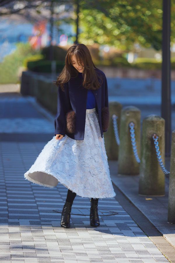 足元でひらりと揺れるジャカードフラワーがドラマチック。ロイヤルブルーのニットとノーブルなーネイビーコートと合わせれば好印象間違いナシ。