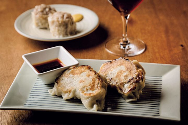 「オープン以来、どんどん大きくなっていて」と阿部シェフが語る餃子は、なめらかな手作りの皮からジューシーな旨みがあふれる。餃子は豚肉・白菜・玉ねぎ・ニラ、焼売は豚肉・玉ねぎというシンプルな餡が食べ飽きさせない。餃子2個¥700、焼売2個¥550、甕出し紹興酒12年グラス¥950