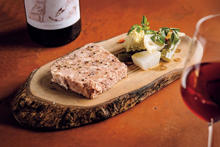 手切りした豚肩ロースの肉肉しい味わいと、しっとりなめらかな白レバーの濃厚さが一体に。田舎風お肉のパテ¥1,500、ワインはグラスで20種類ほど取り揃えて¥1,500前後~、ボトルは¥7,000~。
