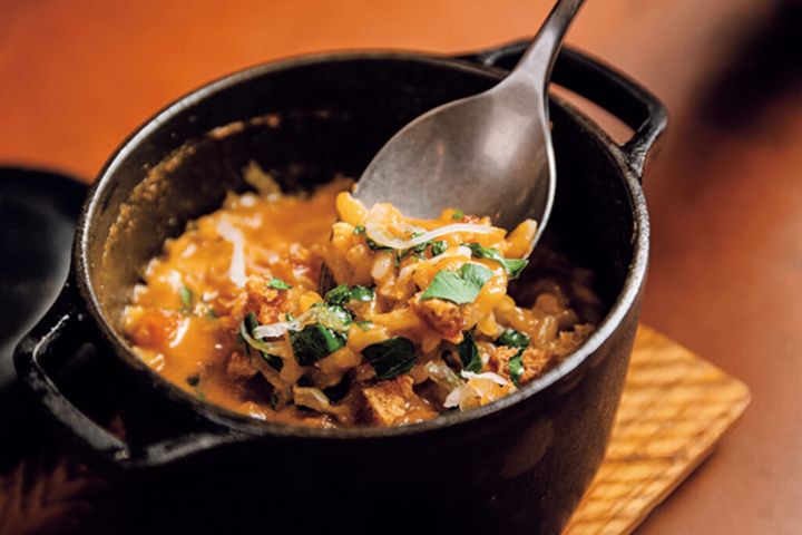 熱々のココットで登場するのは「ビストロ・シンバ」のスペシャリテであるブイヤベースのスープをお米にまとわせたリゾット。店仕舞いが早い銀座界隈で、遅い時間でも〆が食べられると評判の一品。シンバ特製ブイヤベースのリゾット¥1,800