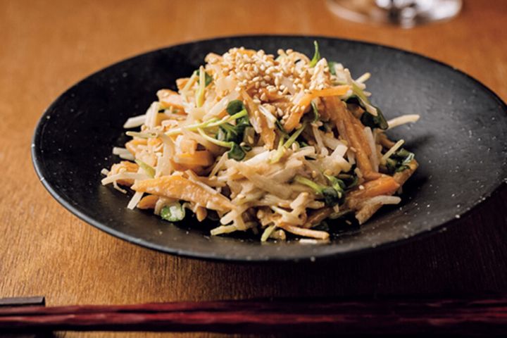 ほんのりと甘い柿とシャキシャキの大根を芝麻醤ベースのドレッシングであえて。際立つ胡麻の香りにレモン果汁がさわやかさをプラス。柿と大根のサラダ¥800