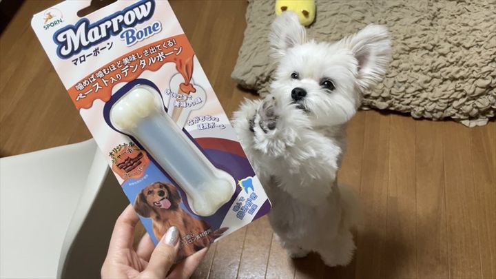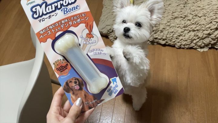 用意したというのは、オリジナルジャーキーのフレーバーだという骨のおもちゃ。 このおもちゃを前にしたぽんたくんは、後ろ足で立ち上がって早くちょうだいとばかりの勢いです。