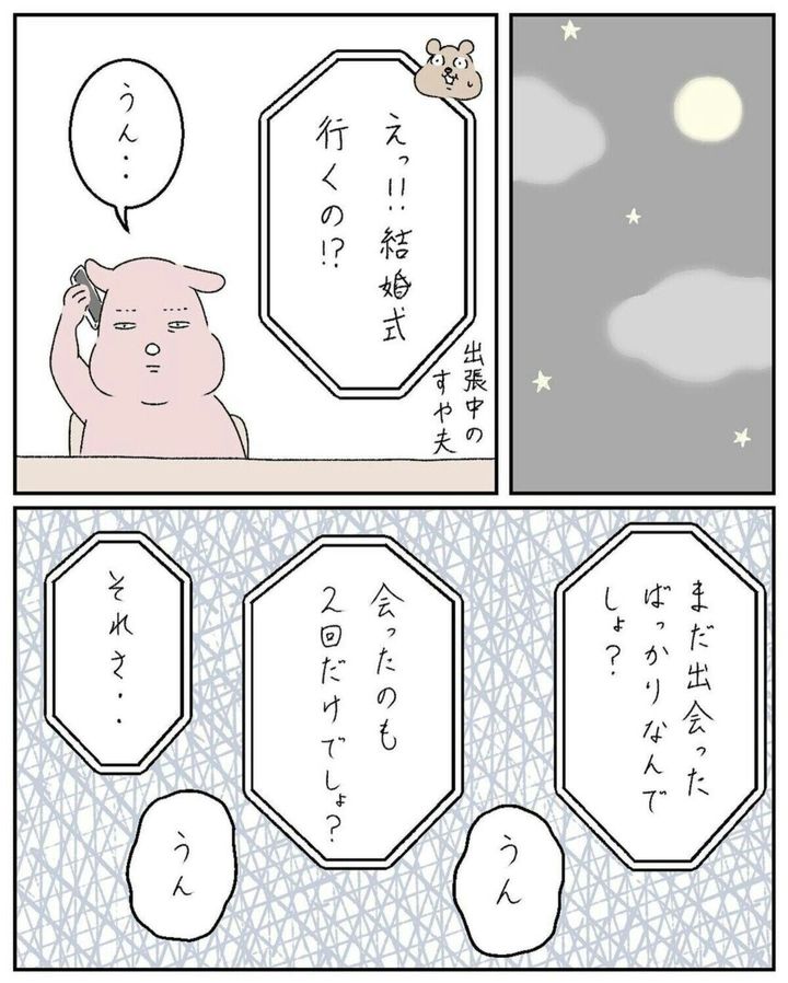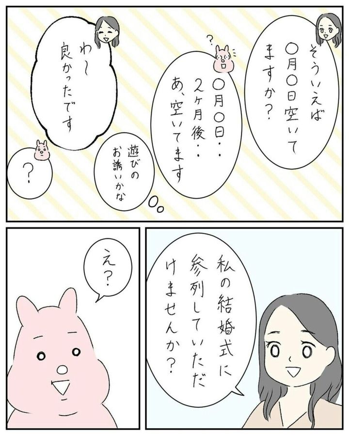 お茶をしながら切り出された話は、よう子さんの結婚式参列へのお願い。まだ2回しか会ったことがなく、よく知らない人の結婚式への参加。迷いに迷いますが、断りづらさがあり参加することにしました。