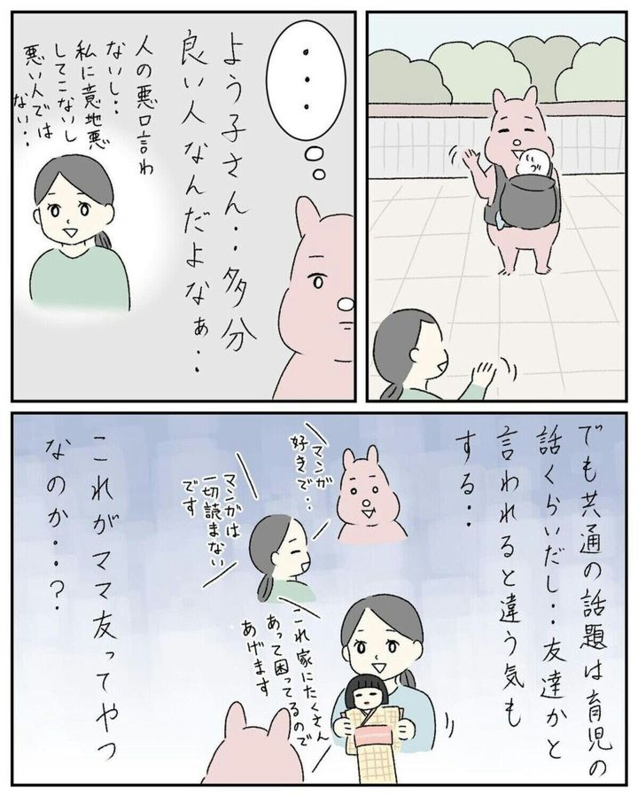 子どものころは一緒に遊んでいると自然と友だちになれましたが、大人になるとそう簡単に友だちはできなくなりますよね。しかし育児が始まると、大変さを共有できる友だちがほしいと思うことも…。この記事で紹介する、すやすや子(@suyasuyakoo)さんの漫画は、ある日突然声をかけられてママ友になった女性とのストーリー。大人の友だちづくりの難しさが感じられます。『ママ友と私』をダイジェストでごらんください。