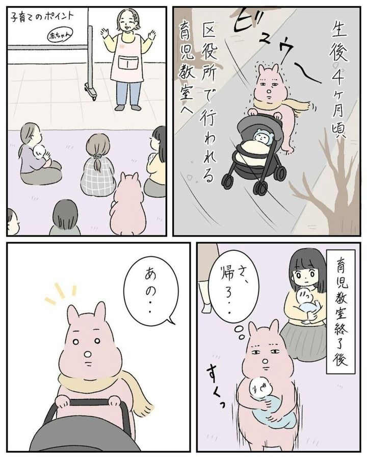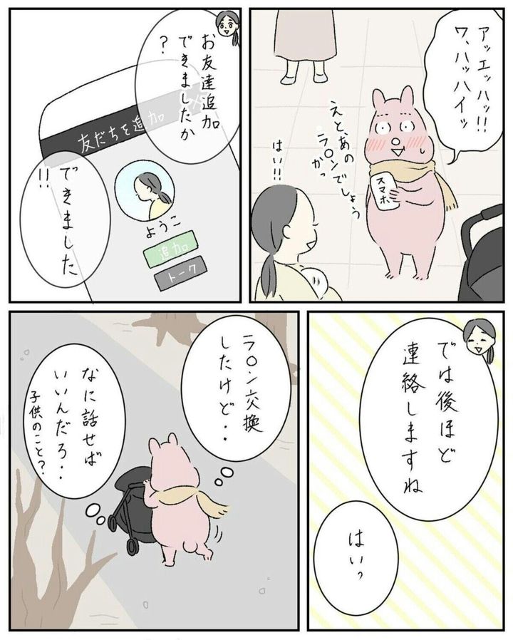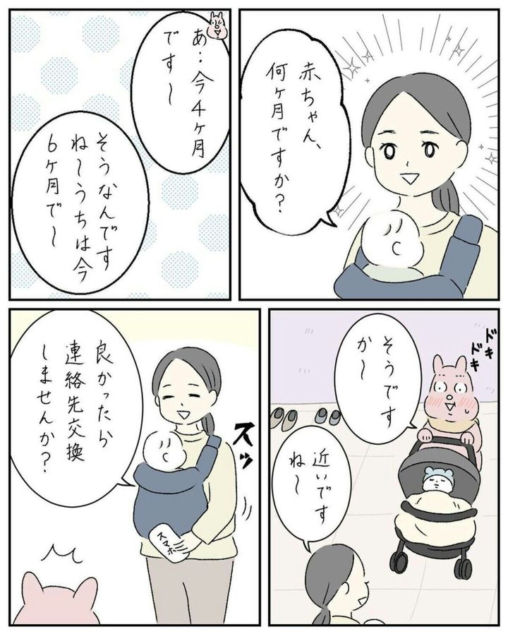 区役所で行われた育児教室に参加した後、すやすや子さんは参加者のよう子さんに声をかけられました。お互いの子どもが生後6か月と4か月、月齢が近いからと連絡先交換をすることに。