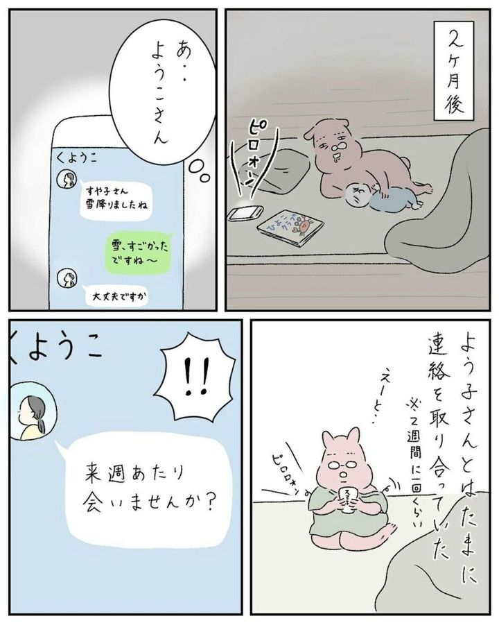 その2か月後、「来週あたり会いませんか?」と連絡が来て、産後初のママ友との外出にわくわくしながら向かったすや子さん。産後はなかなかおしゃれができなかったようですが、一生懸命身支度ををする様子がほほ笑ましいですね。