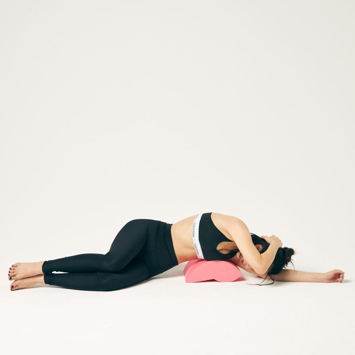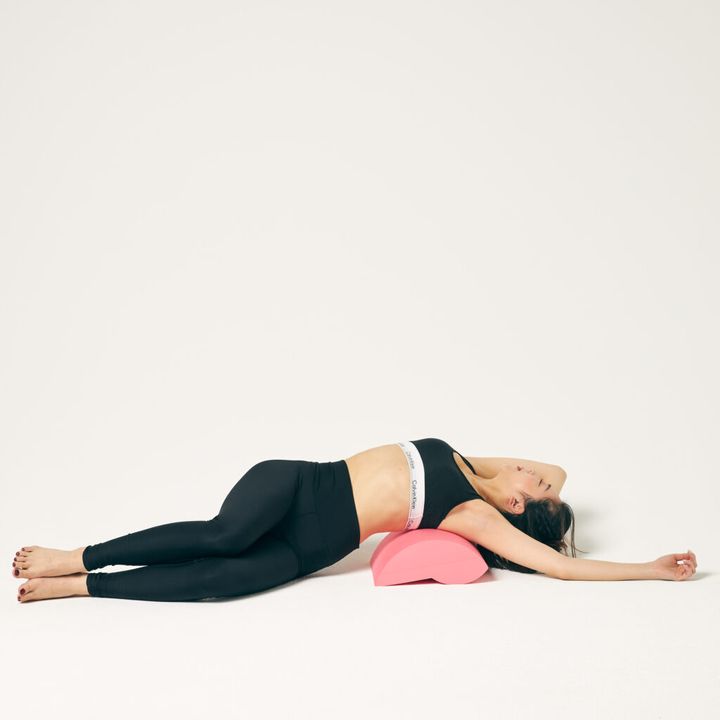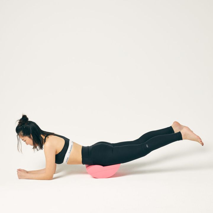 ①ツールのミニアーチに左右の腰骨を真っ直ぐのせ、両肘をついて肋骨とみぞおちを持ち上げます。