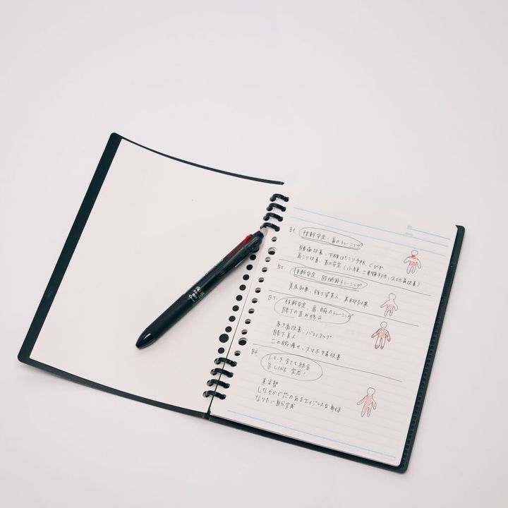 インストラクターになってから必ず持ち歩いているノートには、その日のメニューに加え、レッスンを通して気付いた点や反省点をメモしています。