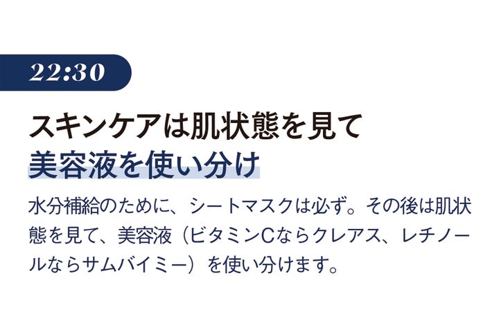 水分補給のために、シートマスクは必ず。その後は肌状態を見て、美容液(ビタミンCならクレアス、レチノールならサムバイミー)を使い分けます。